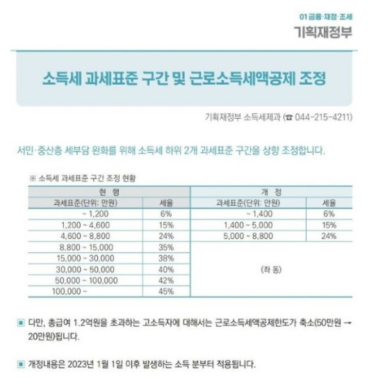 2023년 1월 1일 이후 발생하는 소득 분부터는 서민·중산층 세금 부담 완화를 위해서 아래와 같이 개정된 세율이 적용된다고 하니 참고 부탁드립니다.