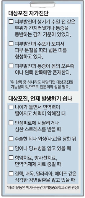 그 이유로 폐경 전후의 중년 여성들이나, 이미 면역력이 많이 떨어져 있는 당뇨 같은 각종 질환을 앓고 있는 환자, 가족 중에서 대상포진을 겪은 사람이 있는 경우에는 많은 주의가 필요하다고 합니다.